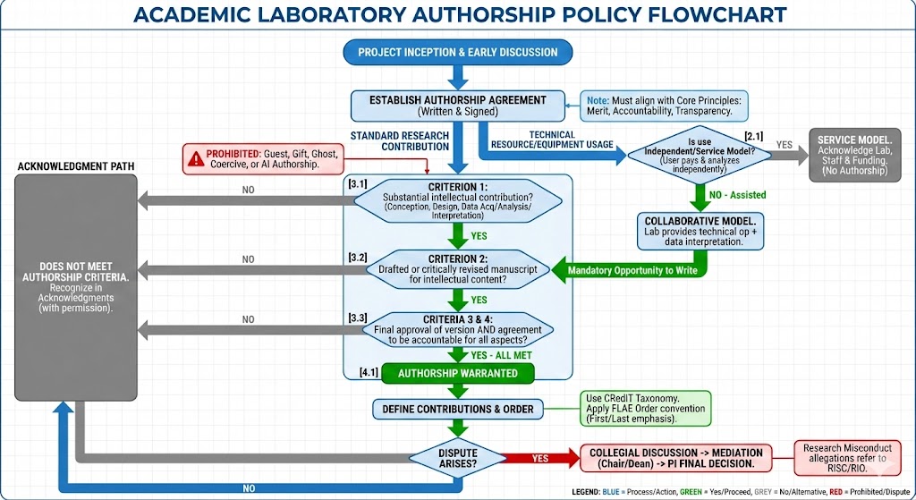 This policy establishes clear and equitable standards for determining authorship on all scholarly outputs from this laboratory, including peer-reviewed publications, conference presentations, preprints, datasets, and software. All laboratory members—faculty, postdoctoral researchers, graduate students, undergraduate students, visiting scholars, and technical staff—must adhere to these guidelines to ensure appropriate attribution of credit, accountability for research integrity, and transparent collaboration^[1, 2, 3]^. This policy aims to prevent authorship disputes by establishing expectations early and documenting agreements throughout the research process^[4, 5, 6]^.